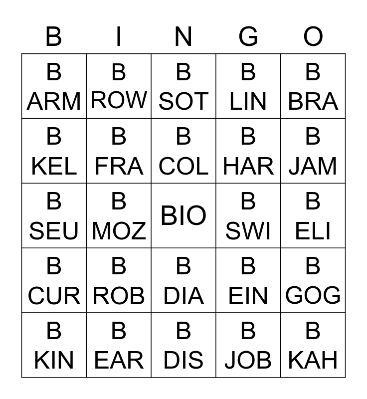 This bingo card has a free space and 29 words: B KIN, B HAM, B MOZ, B GOO, B ARM, B SOT, B FRA, B ROB, B SWI, B EAR, B ELI, B KAH, B DIS, B JOB, B JAM, B BIL, B DIA, B CUR, B BRA, B SEU, B EIN, B PAR, B HAR, B KEL, B LIN, B ROW, B GOG, B COL and B RON.
