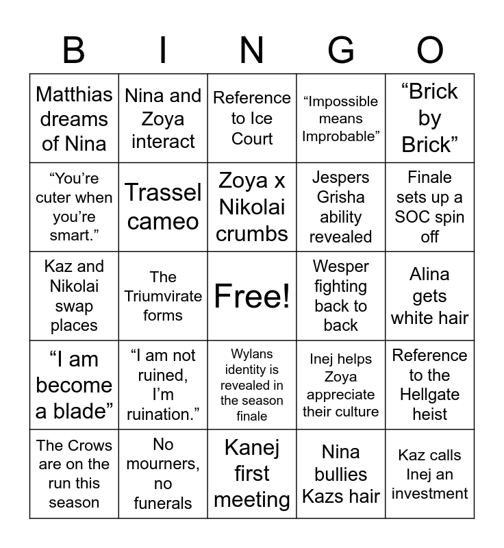 This bingo card has a free space and 25 words: “I am not ruined, I’m ruination.”, Kanej first meeting, Zoya x Nikolai crumbs, The Crows are on the run this season, “Brick by Brick”, Matthias dreams of Nina, “You’re cuter when you’re smart.”, Nina and Zoya interact, Wesper fighting back to back, Wylans identity is revealed in the season finale, Jespers Grisha ability revealed, Kaz and Nikolai swap places, Inej helps Zoya appreciate their culture, Reference to the Hellgate heist, Trassel cameo, Kaz calls Jesper Jordie, Alina gets white hair, Reference to Ice Court, Finale sets up a SOC spin off, The Triumvirate forms, Kaz calls Inej an investment, No mourners, no funerals, “I am become a blade”, “Impossible means Improbable” and Nina bullies Kazs hair.