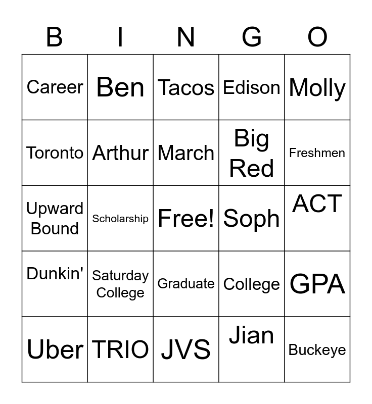 This bingo card has a free space and 34 words: Marlo, Jian, Tracy, Len, Dunkin', Arthur, Molly, Uber, Ben, Lucy, March, Tacos, Senior, Junior, Soph, Freshmen, TRIO, Upward Bound, Saturday College, College, Graduate, Success, Career, ACT, JVS, Buckeye, Edison, Creek, Big Red, Toronto, Test, Scholarship, GPA and EGCC.