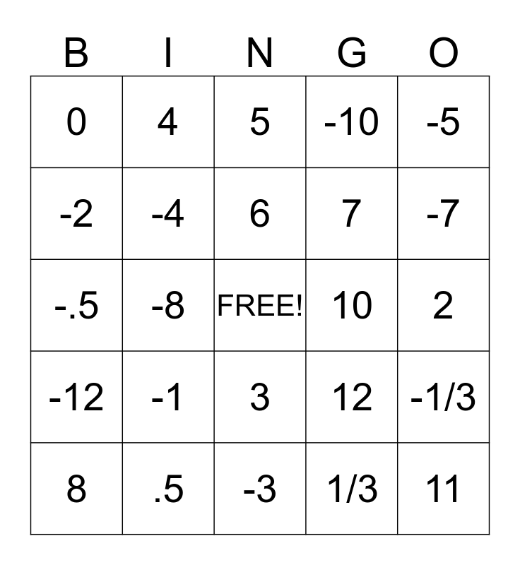 This bingo card has a free space and 24 words: -1, .5, 6, 8, -5, 0, -2, 4, 10, 3, 7, -.5, 12, -1/3, -4, 1/3, 2, 5, -7, -8, 11, -12, -10 and -3.