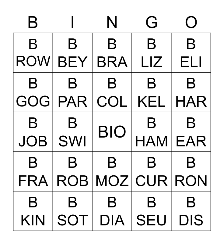 This bingo card has a free space and 29 words: B KIN, B ARM, B SWI, B BIL, B ROW, B BRA, B PAR, B ROB, B HAM, B SOT, B EAR, B DIS, B DIA, B SEU, B HAR, B WIL, B MOZ, B FRA, B ELI, B JOB, B CUR, B EIN, B KEL, B GOG, B LIZ, B BEY, B RON, B COL and B LIN.