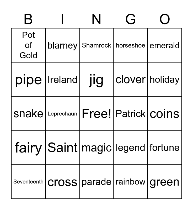 This bingo card has a free space and 29 words: Seventeenth, Irish, Leprechaun, March, Pot of Gold, Shamrock, Ireland, Saint, Patrick, cross, coins, green, parade, rainbow, holiday, luck, magic, fairy, emerald, snake, legend, harp, clover, pipe, horseshoe, blarney, fortune, jig and tradition.