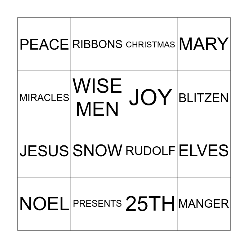 This bingo card has 21 words: PRESENTS, BOWS, RIBBONS, TREES SKIRT, 25TH, JOY, PEACE, CHRISTMAS, RUDOLF, BLITZEN, JESUS, MARY, MANGER, SHEPARD, WISE MEN, JACKFROST, NOEL, SNOW, MIRACLES, ELVES and SANTA CLAUS.