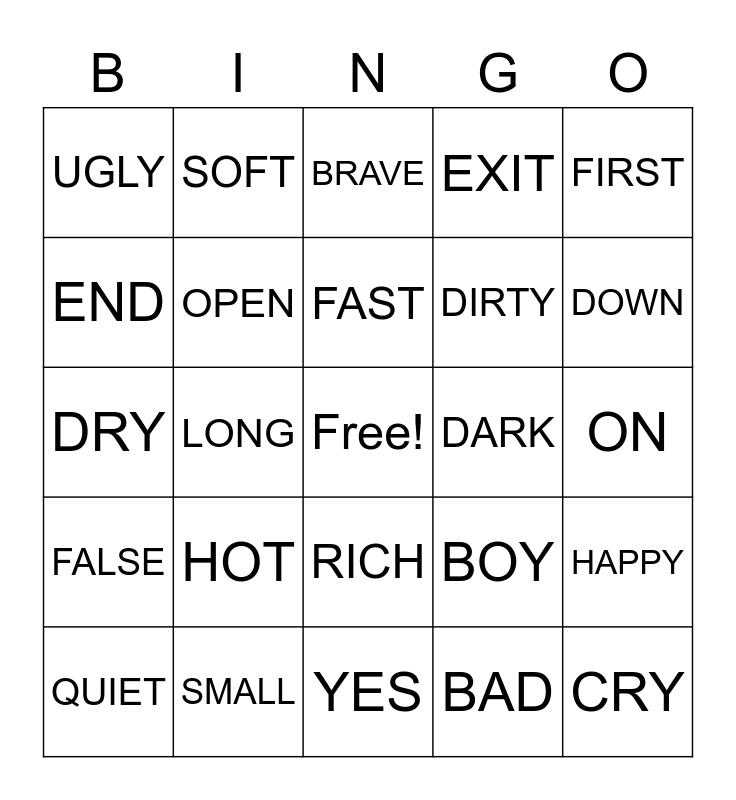 This bingo card has a free space and 24 words: HOT, SMALL, FAST, QUIET, FIRST, UGLY, END, SOFT, DARK, RICH, DIRTY, DRY, BOY, HAPPY, OPEN, BAD, ON, BRAVE, DOWN, LONG, CRY, FALSE, EXIT and YES.