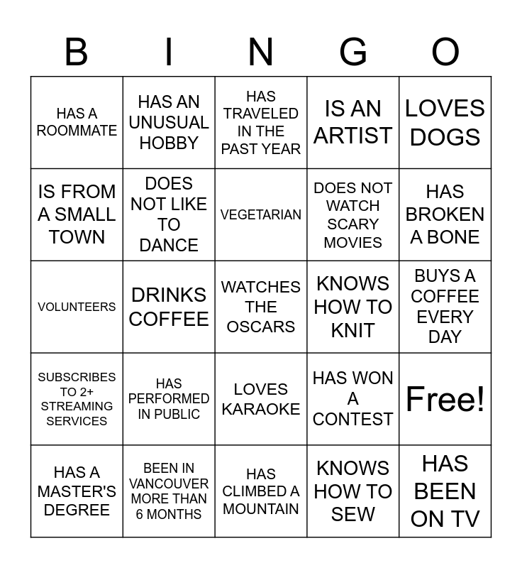 This bingo card has 89 words: KNOWS MARTIAL ARTS, ATTENDED A CONCERT LAST YEAR, LOVES KARAOKE, HAS ACTED IN A PLAY, LIKES PINEAPPLE ON PIZZA, COLLECTS SOMETHING, CURRENTLY A STUDENT, HAS CHILDREN, DIGITAL NOMAD, SAME BIRTH MONTH AS YOU, HAS A MESSY DESK, BIKES TO WORK OR SCHOOL, Free!, BUYS A COFFEE EVERY DAY, SPEAKS 2+ LANGUAGES, VEGETARIAN, PLAYS THE GUITAR, BEEN IN VANCOUVER LESS THAN 2 MONTHS, SPEAKS THE SAME FIRST LANGUAGE AS YOU, CAN CODE, HAS A NICKNAME, READ 10+ BOOKS LAST YEAR, HAS CLIMBED A MOUNTAIN, HAS A HIDDEN TALENT, VOLUNTEERS, BEEN IN VANCOUVER MORE THAN 6 MONTHS, HAS QUIT A BAD HABIT, PLAYS AN INSTRUMENT, HAS A PET, FIRST TIME AT ESL CONVERSATION PRACTICE, IS AN ARTIST, DRINKS COFFEE, DOES NOT DRINK COFFEE, HAS A ROOMMATE, REGULAR AT ESL CONVERSATION PRACTICE, HAS TRAVELED IN THE PAST YEAR, IS FROM A SMALL TOWN, DOES YOGA, HAS BROKEN A BONE, HAS A MASTER'S DEGREE, SUBSCRIBES TO 2+ STREAMING SERVICES, IS INTO ASTROLOGY, IS AN ONLY CHILD, IS A NIGHT OWL, HAS WON A CONTEST, KNOWS HOW TO KNIT, IS NAMED AFTER A RELATIVE, IS LEFT HANDED, HAS A DRIVER'S LICENSE, HAS AN UNUSUAL HOBBY, HAS VISITED 4+ CONTINENTS, BRINGS THEIR OWN LUNCH, HAS 2+ SIBLINGS, LOVES ROLLER COASTERS, PLAYS THE PIANO, PLAYS SPORTS, IS A MORNING PERSON, HAS A PHOBIA, IS FROM A BIG CITY, IS A TWIN OR TRIPLET, HAS RECEIVED AN AWARD, HAS THE SAME FAVOURITE COLOUR AS YOU, READS OR WRITES POETRY, LOVES TO DANCE, GOES BIRD WATCHING, KNOWS HOW TO RIDE A HORSE, SCREAMS DURING SCARY MOVIES, IS A GOOD COOK, WATCHES THE OLYMPICS, HAS PERFORMED IN PUBLIC, WATCHES THE OSCARS, GOOD AT PUBLIC SPEAKING, WEARS CONTACT LENSES, DOES NOT WATCH SCARY MOVIES, DOES NOT LIKE TO DANCE, KNOWS HOW TO SEW, GOES RUNNING, LOVES TO SING, HAS 0 UNREAD EMAILS, HAS BEEN ON TV, LOVES DOGS, DOES NOT HAVE ROOMMATES, LOVES CATS, LIKES TO GARDEN, LISTENS TO PODCASTS, KNOWS HOW TO REPAIR A CAR, BEEN IN VANCOUVER LESS THAN TWO WEEKS, KNOWS HOW TO REPAIR A and HAS BEEN STUNG BY A BEE.
