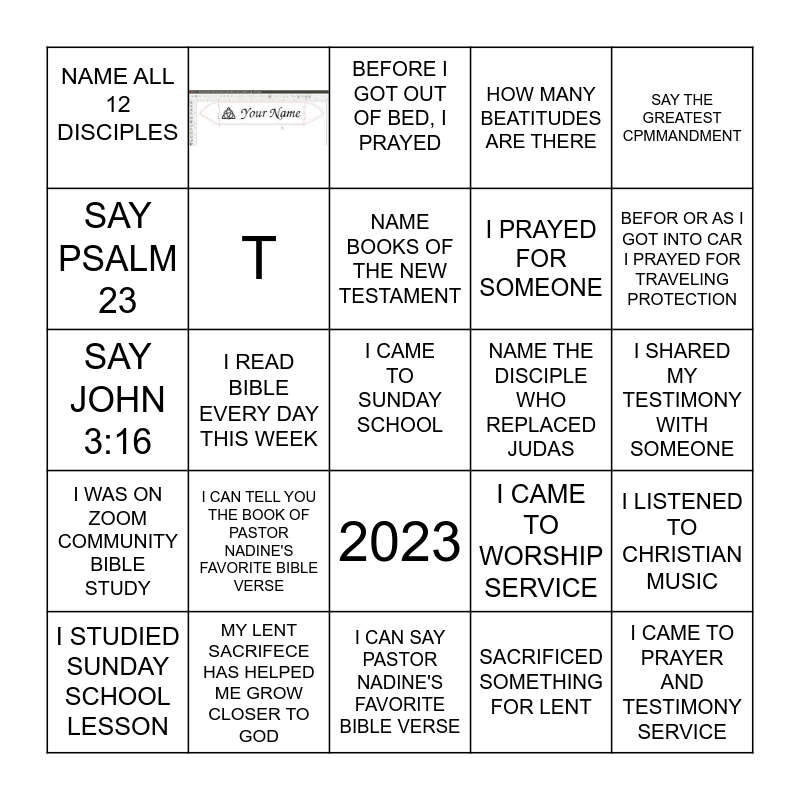 This bingo card has 1 images and 34 words: L, E, N, T, 2023, HOW MANY BEATITUDES ARE THERE, SAY PSALM 23, NAME BOOKS OF THE OLD TESTAMENT, NAME BOOKS OF THE NEW TESTAMENT, SAY 10 COMMANDMENTS IN ORDER, SAY JOHN 3:16, SAY THE GREATEST CPMMANDMENT, LENT 2023!, SAY THE GREAST COMMISSSION, NAME ALL 12 DISCIPLES, NAME THE DISCIPLE WHO REPLACED JUDAS, SACRIFICED SOMETHING FOR LENT, I READ BIBLE EVERY DAY THIS WEEK, I WAS ON ZOOM COMMUNITY BIBLE STUDY, I CAME TO SUNDAY SCHOOL, I CAME TO WORSHIP SERVICE, I STUDIED SUNDAY SCHOOL LESSON, I LISTENED TO CHRISTIAN MUSIC, MY LENT SACRIFECE HAS HELPED ME GROW CLOSER TO GOD, BEFORE I GOT OUT OF BED, I PRAYED, BEFOR OR AS I GOT INTO CAR I PRAYED FOR TRAVELING PROTECTION, I CAME TO PRAYER AND TESTIMONY SERVICE, I CAME TO WOMENS CONNECTING, I PRAYED FOR SOMEONE, I SHARED MY TESTIMONY WITH SOMEONE, I CAN NAME THE FRUITS OF THE SPIRIT, I CAN SAY PASTOR NADINE'S FAVORITE BIBLE VERSE, I CAN TELL YOU THE BOOK OF PASTOR NADINE'S FAVORITE BIBLE VERSE and I CANTELL YOU THE CHAPTER AND VERSE OF PASTOR NADINE'S FAVORITE BIBLE VERSE.