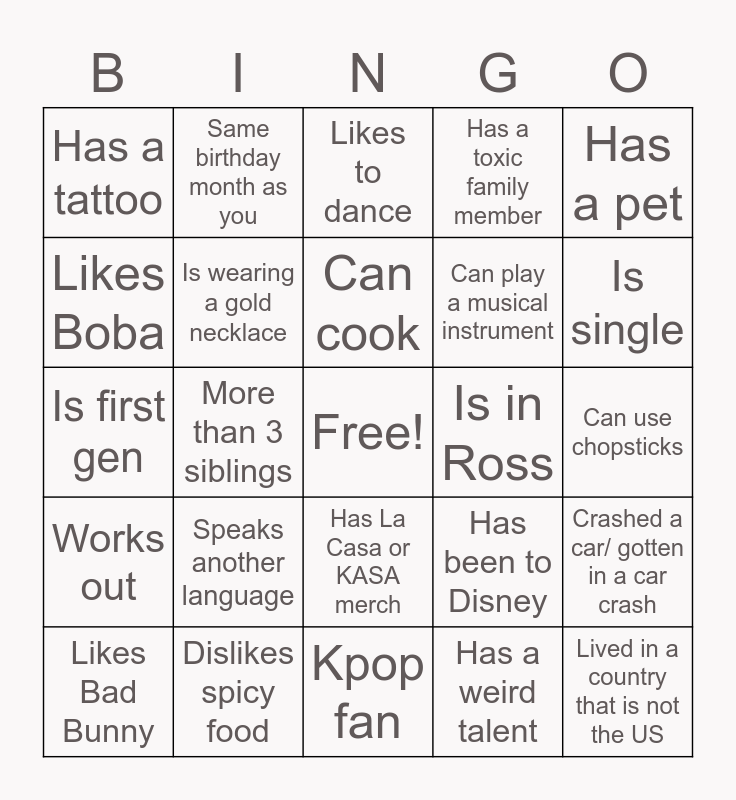 This bingo card has a free space and 24 words: Speaks another language, Dislikes spicy food, Can cook, Likes Bad Bunny, Has a pet, Has a tattoo, Likes Boba, Same birthday month as you, Is in Ross, Has La Casa or KASA merch, Can play a musical instrument, Is first gen, Has been to Disney, Crashed a car/ gotten in a car crash, Is wearing a gold necklace, Has a weird talent, Can use chopsticks, Likes to dance, Is single, More than 3 siblings, Lived in a country that is not the US, Works out, Has a toxic family member and Kpop fan.