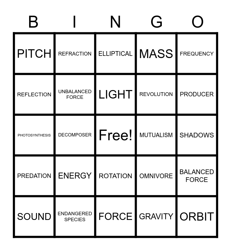 This bingo card has a free space and 24 words: ENERGY, ENDANGERED SPECIES, LIGHT, SOUND, FREQUENCY, PITCH, REFLECTION, REFRACTION, MUTUALISM, ROTATION, REVOLUTION, PHOTOSYNTHESIS, OMNIVORE, BALANCED FORCE, UNBALANCED FORCE, GRAVITY, SHADOWS, ELLIPTICAL, PRODUCER, DECOMPOSER, ORBIT, PREDATION, MASS and FORCE.