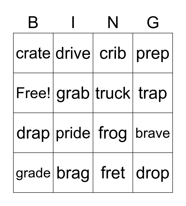 This bingo card has 16 words: brag, brave, crib, crate, drap, drive, frog, fret, Free!, grab, grade, prep, pride, trap, truck and drop.