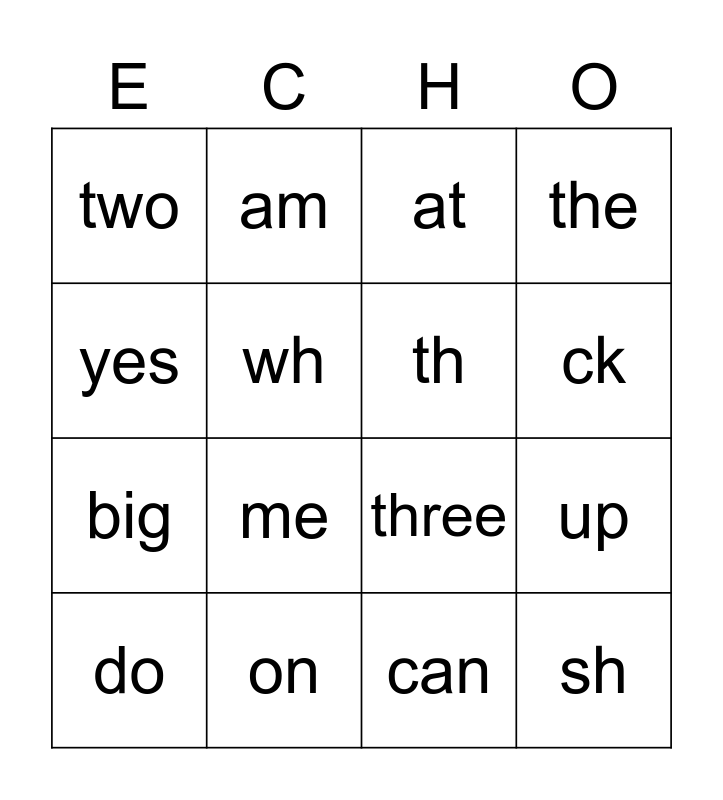 This bingo card has 20 words: up, get, at, one, do, yes, on, two, big, am, me, three, wh, sh, th, ch, ck, the, can and is.