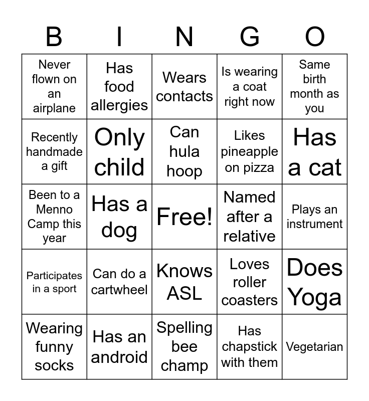 This bingo card has a free space and 25 words: Can do a cartwheel, Spelling bee champ, Can hula hoop, Wearing funny socks, Same birth month as you, Never flown on an airplane, Recently handmade a gift, Has food allergies, Named after a relative, Knows ASL, Likes pineapple on pizza, Been to a Menno Camp this year, Loves roller coasters, Does Yoga, Only child, Lived in another country, Plays an instrument, Wears contacts, Has a cat, Has a dog, Vegetarian, Has an android, Participates in a sport, Is wearing a coat right now and Has chapstick with them.