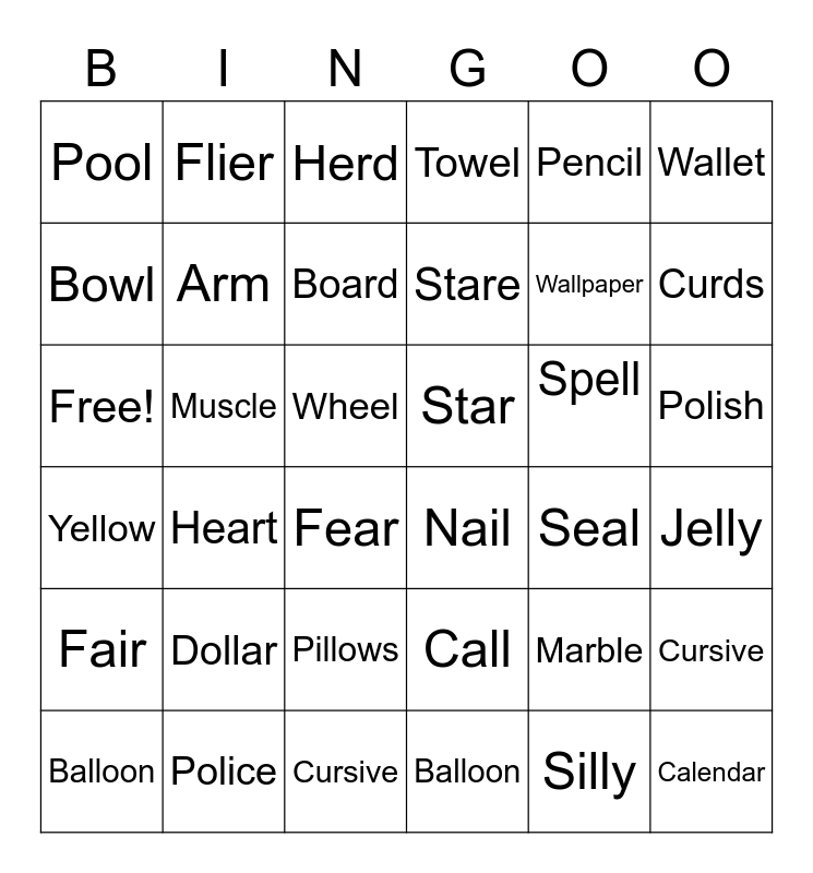 This bingo card has 36 words: Call, Pillows, Balloon, Bowl, Yellow, Star, Arm, Cursive, Pencil, Marble, Curds, Towel, Cursive, Muscle, Stare, Pool, Fair, Spell, Free!, Herd, Wheel, Heart, Nail, Fear, Seal, Flier, Wallpaper, Police, Board, Wallet, Calendar, Balloon, Jelly, Polish, Dollar and Silly.