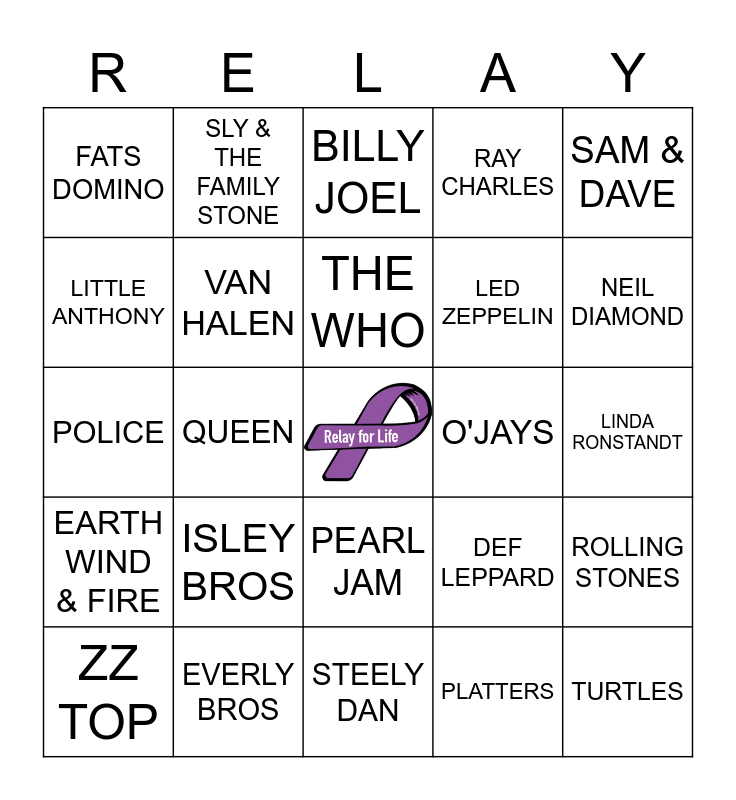 This bingo card has a free space and 24 words: ISLEY BROS, EVERLY BROS, THE WHO, ZZ TOP, SAM & DAVE, FATS DOMINO, LITTLE ANTHONY, SLY & THE FAMILY STONE, O'JAYS, PEARL JAM, LED ZEPPELIN, POLICE, DEF LEPPARD, ROLLING STONES, VAN HALEN, PLATTERS, LINDA RONSTANDT, BILLY JOEL, NEIL DIAMOND, QUEEN, TURTLES, EARTH WIND & FIRE, RAY CHARLES and STEELY DAN.