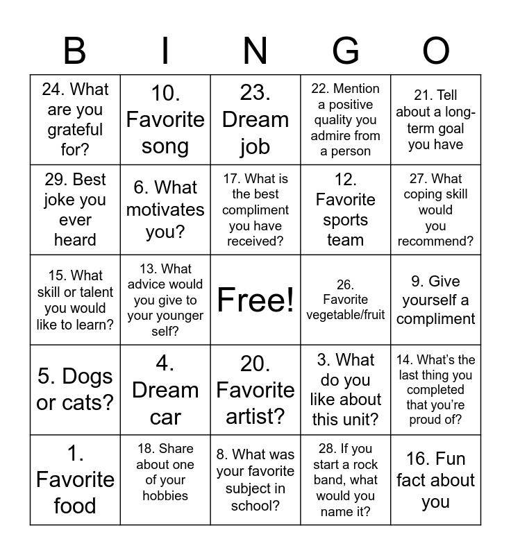 This bingo card has a free space and 29 words: 1. Favorite food, 2. What country would you like to visit?, 13. What advice would you give to your younger self?, 19. What is your spiritual animal?, 24. What are you grateful for?, 23. Dream job, 6. What motivates you?, 4. Dream car, 26. Favorite vegetable/fruit, 18. Share about one of your hobbies, 9. Give yourself a compliment, 16. Fun fact about you, 8. What was your favorite subject in school?, 28. If you start a rock band, what would you name it?, 27. What coping skill would you recommend?, 7. A good advice you received, 20. Favorite artist?, 5. Dogs or cats?, 21. Tell about a long-term goal you have, 15. What skill or talent you would like to learn?, 3. What do you like about this unit?, 25. What was your first job?, 12. Favorite sports team, 29. Best joke you ever heard, 22. Mention a positive quality you admire from a person, 10. Favorite song, 14. What’s the last thing you completed that you’re proud of?, 17. What is the best compliment you have received? and 11. If you could have any superpower what would it be?.