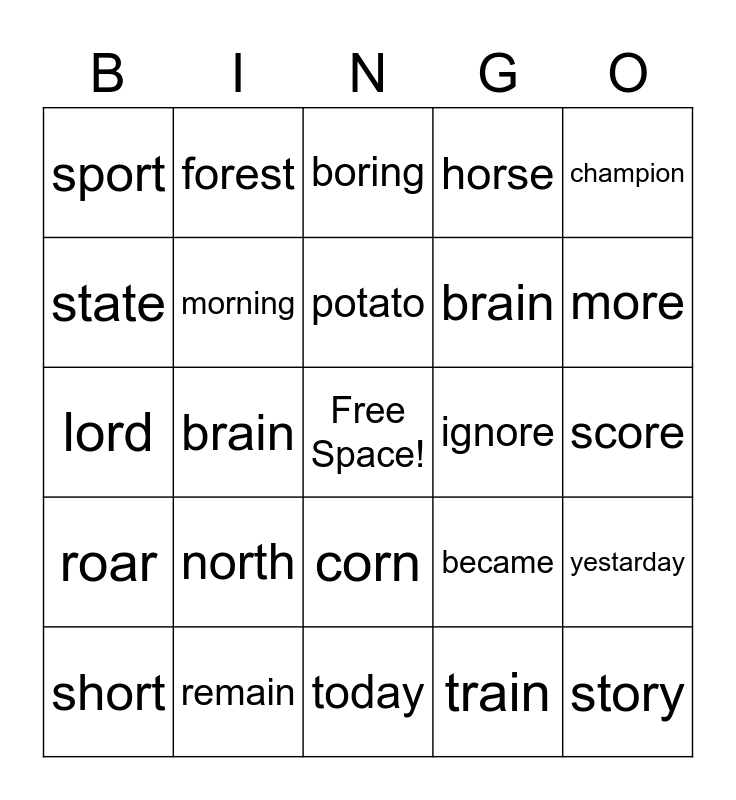 This bingo card has a free space and 33 words: shore, store, brain, before, roar, morning, champion, short, forest, became, potato, boring, explore, victory, ignore, more, remain, lord, north, became, corn, fork, sport, score, today, story, horse, brain, state, yestarday, holiday, train and became.