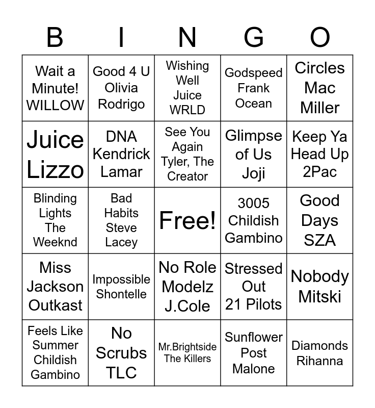 This bingo card has a free space and 30 words: No Scrubs TLC, Dark Red Steve Lacey, Bad Habits Steve Lacey, Crazy Gnarles Barkley, Wait a Minute! WILLOW, Wishing Well Juice WRLD, DNA Kendrick Lamar, No Role Modelz J.Cole, 3005 Childish Gambino, Mr.Brightside The Killers, Good Days SZA, Diamonds Rihanna, Sunflower Post Malone, Big Poppa Notorious BIG, Keep Ya Head Up 2Pac, Drivers Liscence Olivia Rodrigo, Stressed Out 21 Pilots, Miss Jackson Outkast, Impossible Shontelle, Circles Mac Miller, Blinding Lights The Weeknd, Hot Line Bling Drake, Good 4 U Olivia Rodrigo, Glimpse of Us Joji, Juice Lizzo, Godspeed Frank Ocean, Nobody Mitski, Feels Like Summer Childish Gambino, See You Again Tyler, The Creator and Star Shopping Lil Peep.