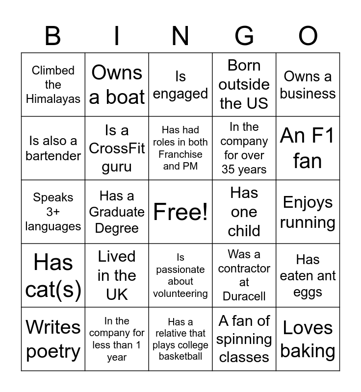 This bingo card has a free space and 24 words: Lived in the UK, In the company for less than 1 year, Has had roles in both Franchise and PM, Writes poetry, Owns a business, Climbed the Himalayas, Is also a bartender, Owns a boat, Has one child, Is passionate about volunteering, In the company for over 35 years, Speaks 3+ languages, Was a contractor at Duracell, Has eaten ant eggs, Is a CrossFit guru, A fan of spinning classes, Enjoys running, Is engaged, An F1 fan, Has a Graduate Degree, Loves baking, Has cat(s), Born outside the US and Has a relative that plays college basketball.