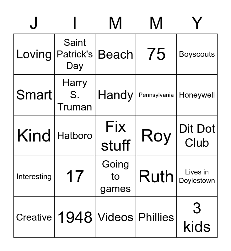 This bingo card has 25 words: Interesting, 1948, Fix stuff, Phillies, Boyscouts, Loving, Saint Patrick's Day, Beach, Roy, Lives in Doylestown, Smart, Harry S. Truman, Videos, Ruth, Honeywell, Creative, Hatboro, Handy, Pennsylvania, Dit Dot Club, Kind, 17, Going to games, 75 and 3 kids.