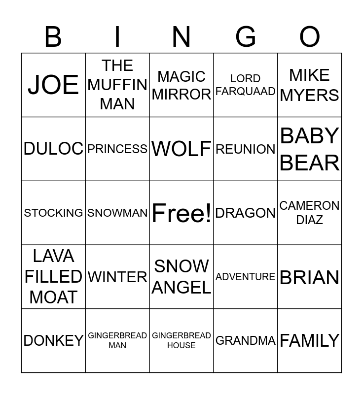 This bingo card has a free space and 58 words: TYLER PERRY, GINGERBREAD MAN, ONION, LAVA FILLED MOAT, GRANDMA, EDDIE MURPHY, PRINCESS, SHREK, REUNION, CURSE, LORD FARQUAAD, MADEA, FAIRYTALE, PINOCCHIO, SWAMP, JOE, FAMILY, MIKE MYERS, FIONA, WOLF, DRAGON, MAGIC MIRROR, DONKEY, BRIAN, SIDEKICK, CAMERON DIAZ, BLIND MOUSE, RESCUE, BABY BEAR, THREE PIGS, OGRE, BELLS, CANDLE, CANDY CANE, CELEBRATION, FROSTY, ELF, SNOWMAN, STOCKING, REINDEER, WINTER, SNOWFLAKE, ADVENTURE, FANTASY, ANIMATION, SCARF, EGGNOG, SNOW ANGEL, GINGERBREAD HOUSE, SNOWBALL, MOOSE, OGRE HUNTER, BLUE FLOWER, RED THORNS, THE MUFFIN MAN, GUMDROP BUTTONS, DULOC and MONSIEUR HOOD.