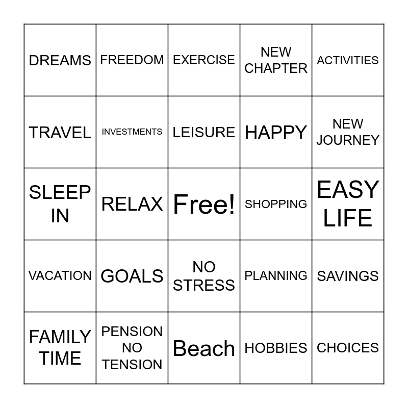 This bingo card has a free space and 24 words: GOALS, PENSION NO TENSION, LEISURE, FAMILY TIME, ACTIVITIES, DREAMS, TRAVEL, FREEDOM, SHOPPING, NO STRESS, HAPPY, SLEEP IN, PLANNING, SAVINGS, INVESTMENTS, HOBBIES, EASY LIFE, EXERCISE, NEW JOURNEY, RELAX, CHOICES, VACATION, NEW CHAPTER and Beach.