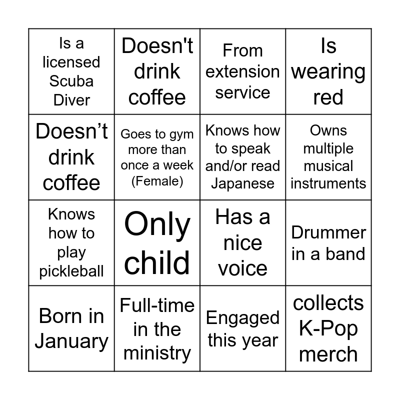 This bingo card has 43 words: Can play two or more instruments, Born in January, 20-30 years old, Middle child, Has a dog, Knows how to swim, From extension service, Can ride a bike, Doesn’t drink coffee, Knows how to drive, Is wearing red, Full-time in the ministry, Number of family members is more than 5, Born outside Laguna, Finished reading the Bible, Read more than 3 books this year, Earliest to time-in in the team, Has a nice voice, Followed a tiktok trend, Only child, Doesn't drink coffee, Passed SWC Advance 2 months after hire date, Has a child, Is a licensed Scuba Diver, Has glasses grade above 500, Engaged this year, collects Funko Pops, dislikes Funko Pops, < 1 year in the team, collects K-Pop merch, > 5 years in SRPH, Has puzzle collection, Inter-college billiards competition winner, Drummer in a band, Has anime action figure collection, More time for cats than self, Loves watching horror stories and articles, Owns multiple musical instruments, Goes to gym more than once a week (Female), Knows how to play pickleball, Can ride a motorcyle, Knows how to speak and/or read Japanese and Lives outside metro manila.