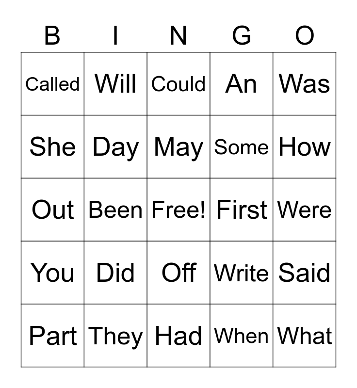 This bingo card has a free space and 30 words: They, About, Been, These, Called, Could, Day, Off, First, Had, Were, What, When, Would, How, There, Write, You, Did, Was, Out, People, Will, Some, She, An, Said, Part, May and Many.