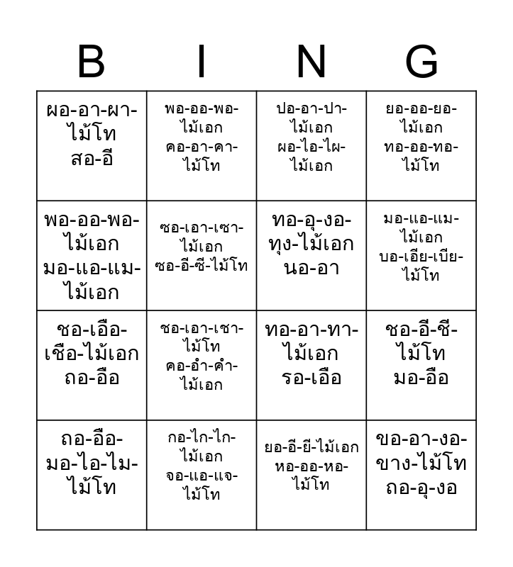 This bingo card has 16 words: กอ-ไก-ไก-ไม้เอก จอ-แอ-แจ-ไม้โท, ชอ-อี-ชี-ไม้โท มอ-อือ, ปอ-อา-ปา-ไม้เอก ผอ-ไอ-ไผ-ไม้เอก, ผอ-อา-ผา-ไม้โท สอ-อี, ชอ-เอือ-เชือ-ไม้เอก ถอ-อือ, พอ-ออ-พอ-ไม้เอก คอ-อา-คา-ไม้โท, ทอ-อา-ทา-ไม้เอก รอ-เอือ, ยอ-อี-ยี-ไม้เอก หอ-ออ-หอ-ไม้โท, พอ-ออ-พอ-ไม้เอก มอ-แอ-แม-ไม้เอก, ซอ-เอา-เซา-ไม้เอก ซอ-อี-ซี-ไม้โท, ถอ-อือ- มอ-ไอ-ไม-ไม้โท, ยอ-ออ-ยอ-ไม้เอก ทอ-ออ-ทอ-ไม้โท, ชอ-เอา-เชา-ไม้โท คอ-อำ-คำ-ไม้เอก, มอ-แอ-แม-ไม้เอก บอ-เอีย-เบีย-ไม้โท, ทอ-อุ-งอ-ทุง-ไม้เอก นอ-อา and ขอ-อา-งอ-ขาง-ไม้โท ถอ-อุ-งอ.