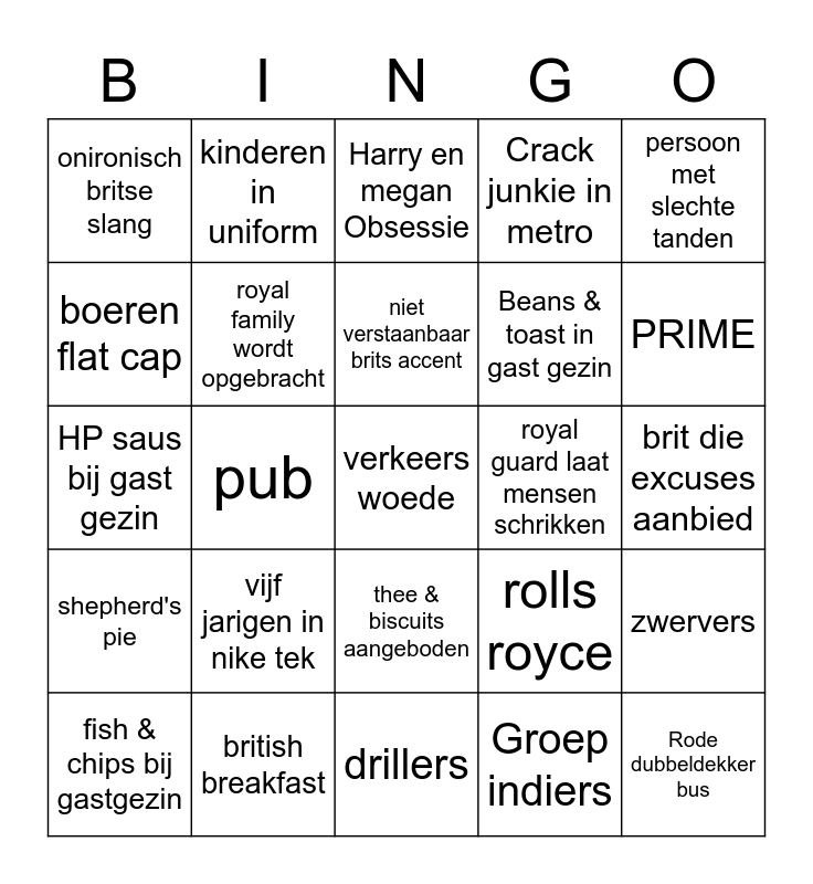 This bingo card has 25 words: vijf jarigen in nike tek, drillers, niet verstaanbaar brits accent, fish & chips bij gastgezin, persoon met slechte tanden, onironisch britse slang, boeren flat cap, kinderen in uniform, royal guard laat mensen schrikken, thee & biscuits aangeboden, Beans & toast in gast gezin, HP saus bij gast gezin, rolls royce, zwervers, royal family wordt opgebracht, Rode dubbeldekker bus, brit die excuses aanbied, Harry en megan Obsessie, PRIME, pub, verkeers woede, british breakfast, shepherd's pie, Crack junkie in metro and Groep indiers.