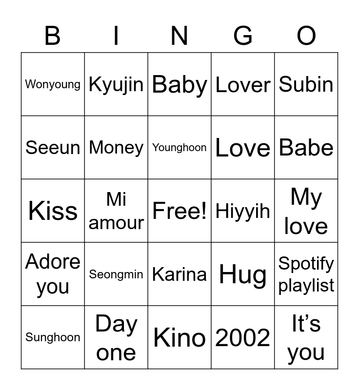 This bingo card has a free space and 25 words: Seongmin, Kino, Younghoon, Sunghoon, Subin, Wonyoung, Seeun, Kyujin, Hiyyih, Karina, Love, Kiss, Hug, Spotify playlist, Money, Sayang, My love, Baby, Babe, Mi amour, It’s you, Day one, Adore you, Lover and 2002.