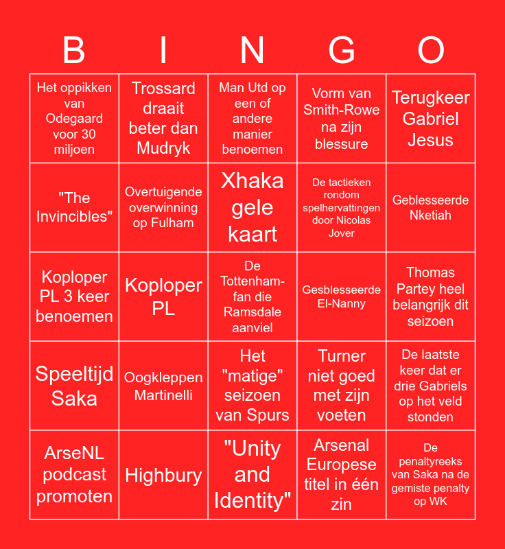 This bingo card has 33 words: De penaltyreeks van Saka na de gemiste penalty op WK, Pauleeeennjoe, Koploper PL, Airpod Albert, Speeltijd Saka, Overtuigende overwinning op Fulham, Terugkeer Gabriel Jesus, ArseNL podcast promoten, Trossard draait beter dan Mudryk, "In het Emirates Stadium", Xhaka gele kaart, Man Utd op een of andere manier benoemen, 5 overtredingen op Saka, One-nil to The Arsenal, Gesblesseerde El-Nanny, Geblesseerde Nketiah, Highbury, Koploper PL 3 keer benoemen, Oogkleppen Martinelli, Turner niet goed met zijn voeten, Het "matige" seizoen van Spurs, Blessure van of oud-Gunner Bellerin, Het oppikken van Odegaard voor 30 miljoen, Thomas Partey heel belangrijk dit seizoen, "Unity and Identity", De Tottenham-fan die Ramsdale aanviel, Vorm van Smith-Rowe na zijn blessure, De tactieken rondom spelhervattingen door Nicolas Jover, "The Invincibles", De laatste keer dat er drie Gabriels op het veld stonden, De "All or Nothing" documentaire, Arsenal Europese titel in één zin and De coëfficientenranglijst in een zin.
