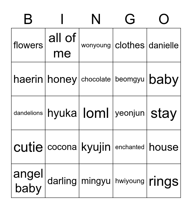 This bingo card has a free space and 24 words: cocona, darling, chocolate, angel baby, danielle, flowers, haerin, all of me, yeonjun, kyujin, beomgyu, dandelions, enchanted, house, honey, hwiyoung, stay, wonyoung, baby, hyuka, rings, cutie, clothes and mingyu.
