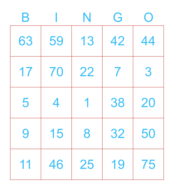 This bingo card has a free space and 24 words: 15, 46, 22, 11, 44, 63, 17, 59, 38, 8, 7, 5, 32, 50, 70, 19, 20, 13, 3, 4, 75, 9, 42 and 25.