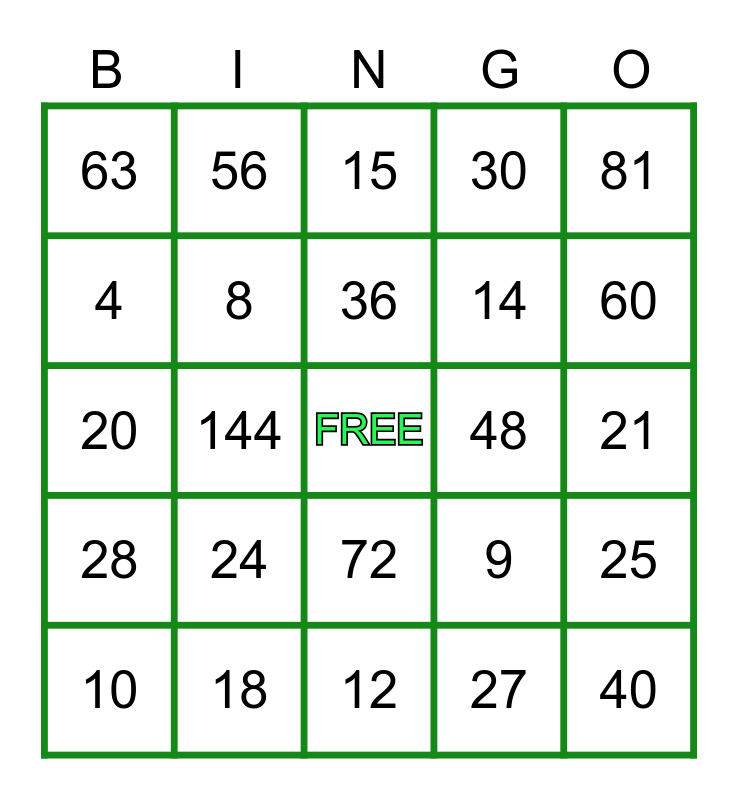 This bingo card has a free space and 24 words: 24, 18, 36, 10, 81, 63, 4, 56, 48, 72, 14, 20, 9, 25, 8, 27, 21, 15, 60, 144, 40, 28, 30 and 12.