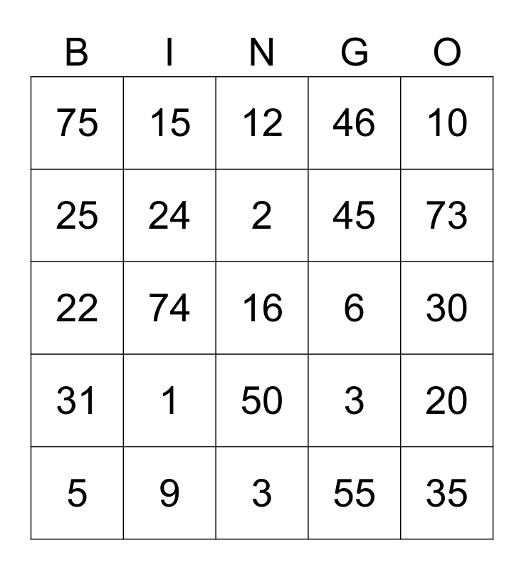This bingo card has 25 words: 1, 3, 2, 5, 10, 75, 25, 15, 6, 50, 45, 22, 3, 20, 24, 35, 30, 12, 73, 74, 16, 9, 31, 46 and 55.