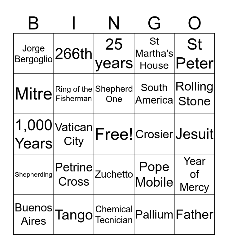This bingo card has a free space and 24 words: Petrine Cross, Tango, Shepherd One, Buenos Aires, St Peter, Jorge Bergoglio, Mitre, 266th, Crosier, Zuchetto, South America, 1,000 Years, Pope Mobile, Year of Mercy, Ring of the Fisherman, Pallium, Jesuit, 25 years, Rolling Stone, Vatican City, Father, Shepherding, St Martha's House and Chemical Tecnician.