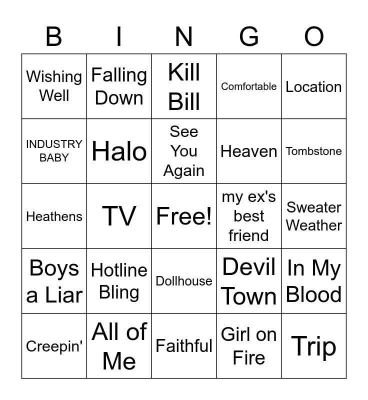 This bingo card has a free space and 24 words: Hotline Bling, All of Me, See You Again, Creepin', Location, Wishing Well, INDUSTRY BABY, Falling Down, my ex's best friend, Dollhouse, Heaven, Heathens, Devil Town, In My Blood, Halo, Girl on Fire, Sweater Weather, Kill Bill, Tombstone, TV, Trip, Boys a Liar, Comfortable and Faithful.