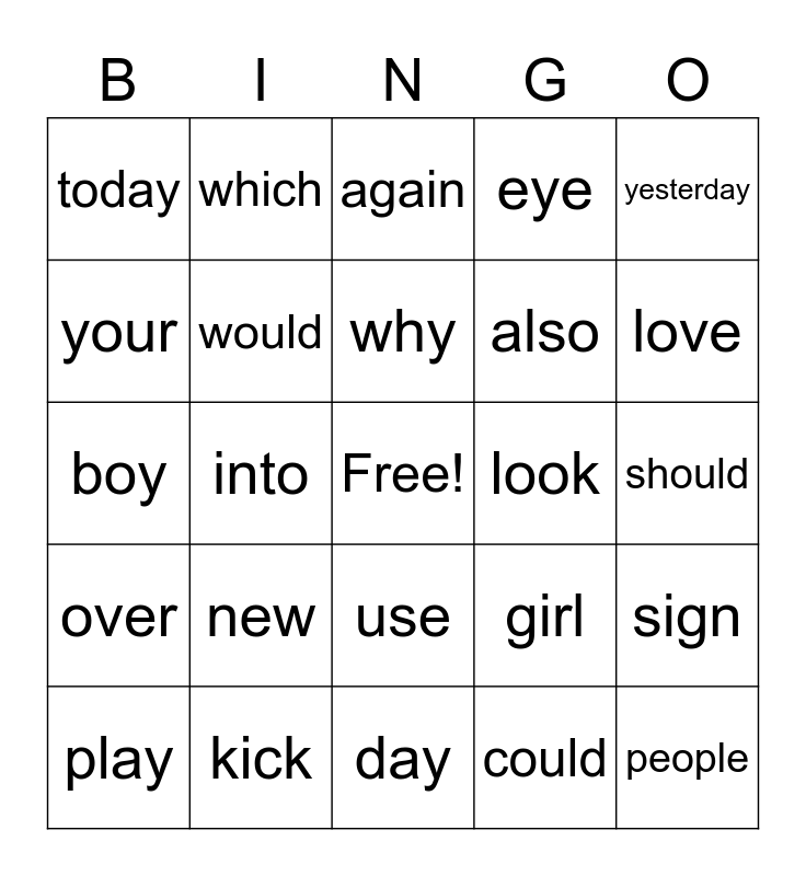 This bingo card has a free space and 24 words: new, kick, why, play, yesterday, today, your, which, look, use, also, boy, girl, sign, would, could, should, again, love, into, people, over, eye and day.