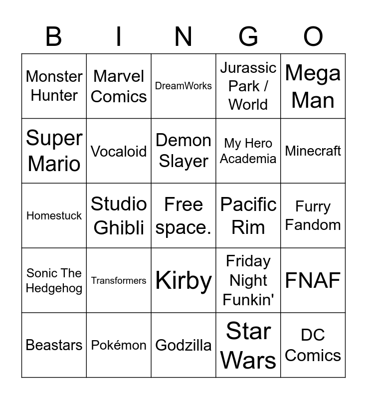 This bingo card has a free space and 24 words: Transformers, Pokémon, Demon Slayer, Beastars, Mega Man, Monster Hunter, Super Mario, Marvel Comics, Pacific Rim, Kirby, My Hero Academia, Homestuck, Friday Night Funkin', FNAF, Vocaloid, Star Wars, Furry Fandom, DreamWorks, Minecraft, Studio Ghibli, DC Comics, Sonic The Hedgehog, Jurassic Park / World and Godzilla.