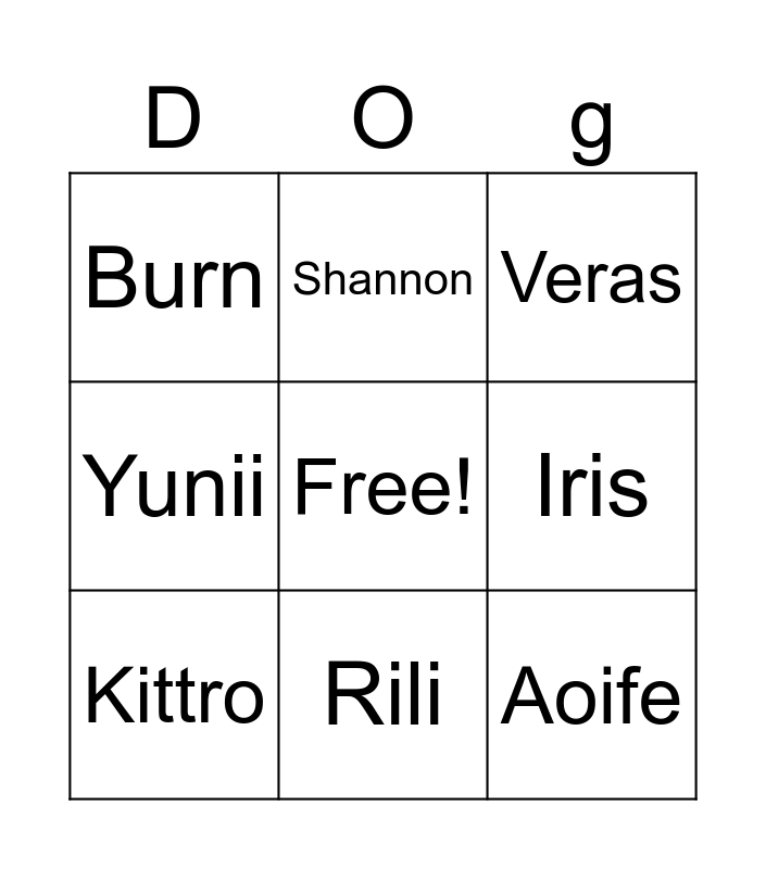 This bingo card has a free space and 8 words: Iris, Veras, Shannon, Kittro, Burn, Aoife, Yunii and Rili.