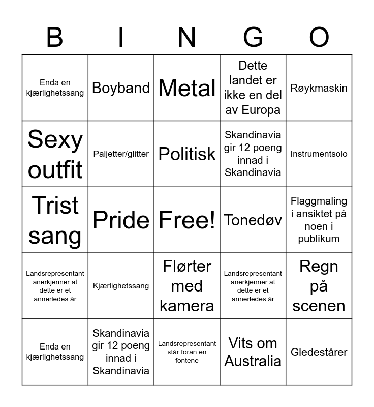 This bingo card has a free space and 114 words: Pyro, To av motsatt kjønn synger en klein kjærlighetssang, Modulering, Regn på scenen, Noen fra bandet får mer hype enn vokalisten(e), UK får 12 poeng, Dette landet er ikke en del av Europa, Vindmaskin, Graham Norton er sassy, Fjær, Paljetter/glitter, Trist sang, Konferansier bytter kostyme, Flaggmaling i ansiktet på noen i publikum, Snooze fest, Break up song, Flørter med kamera, «Thank you Europe‼!», Gledestårer, Kjærlighetssang, Enda en kjærlighetssang, Metal, Bananer, Akrobater, Boyband, Landsrepresentant anerkjenner at dette er et annerledes år, Skandinavia gir 12 poeng innad i Skandinavia, Artist synger til kamera mer enn publikum, Partyfaktor, Hit-faktor, Instrumentsolo, Politisk, Pride, Feministisk, «Good evening Europe», Røykmaskin, Kostymeskift midt i sangen, Synkronisert danserutine, Rap, Folkets favoritt er juryens favoritt, Artist synger ikke på engelsk, Artist har på seg maske, Nasjonaldrakt, Besøk av en ESC-legende, Tekno, Humor, Vits om Australia, Sexy outfit, Overload, Landsrepresentant står foran en fontene, Landsrepresentant står foran landets mest kjente landmerke, Tonedøv, 80´s vibe, ABBA-referanse, Konferansier (vert) synger, Gen Z-hjerte, Millennial hjerte, Pyro, To av motsatt kjønn synger en klein kjærlighetssang, Modulering, Regn på scenen, Noen fra bandet får mer hype enn vokalisten(e), UK får 12 poeng, Dette landet er ikke en del av Europa, Vindmaskin, Graham Norton er sassy, Fjær, Paljetter/glitter, Trist sang, Konferansier bytter kostyme, Flaggmaling i ansiktet på noen i publikum, Snooze fest, Break up song, Flørter med kamera, «Thank you Europe‼!», Gledestårer, Kjærlighetssang, Enda en kjærlighetssang, Metal, Bananer, Akrobater, Boyband, 80´vibe, Landsrepresentant anerkjenner at dette er et annerledes år, Skandinavia gir 12 poeng innad i Skandinavia, Artist synger til kamera mer enn publikum, Partyfaktor, Hit-faktor, Instrumentsolo, Politisk, Pride, Feministisk, «Good evening Europe», Røykmaskin, Kostymeskift midt i sangen, Synkronisert danserutine, Rap, Folkets favoritt er juryens favoritt, Artist synger ikke på engelsk, Artist har på seg maske, Nasjonaldrakt, Besøk av en ESC-legende, Tekno, Humor, Vits om Australia, Sexy outfit, Overload, Landsrepresentant står foran en fontene, Landsrepresentant står foran landets mest kjente landmerke, Tonedøv, ABBA-referanse, Konferansier (vert) synger, Gen Z-hjerte and Millennial hjerte.