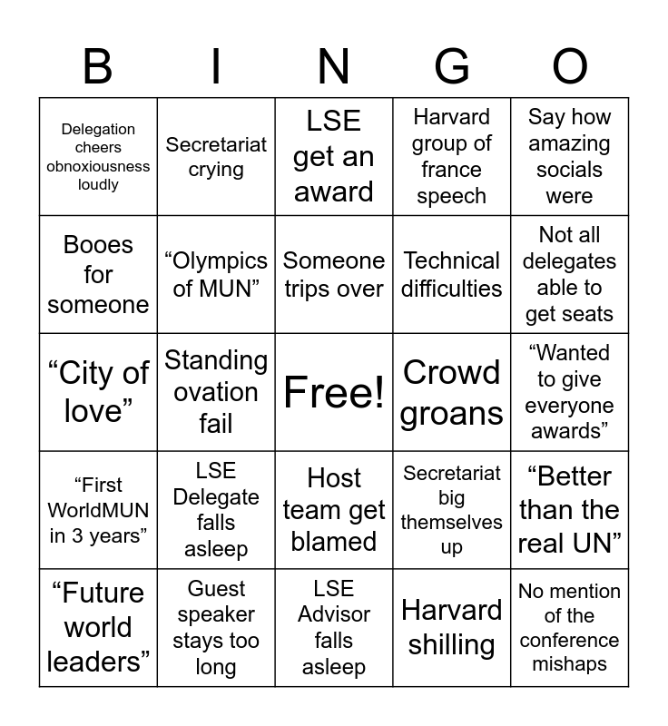This bingo card has a free space and 24 words: LSE Delegate falls asleep, Guest speaker stays too long, Someone trips over, “Future world leaders”, Say how amazing socials were, Delegation cheers obnoxiousness loudly, Booes for someone, Secretariat crying, Crowd groans, Host team get blamed, Technical difficulties, “City of love”, Secretariat big themselves up, “Better than the real UN”, “Olympics of MUN”, Harvard shilling, “Wanted to give everyone awards”, LSE get an award, Not all delegates able to get seats, Standing ovation fail, No mention of the conference mishaps, “First WorldMUN in 3 years”, Harvard group of france speech and LSE Advisor falls asleep.