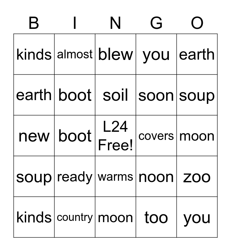 This bingo card has a free space and 24 words: ready, country, soil, kinds, earth, kinds, earth, almost, covers, warms, soon, new, noon, zoo, boot, too, moon, blew, soup, boot, you, soup, you and moon.