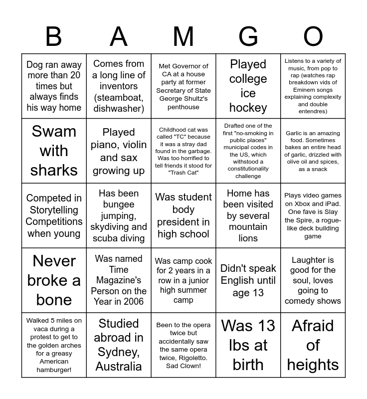 This bingo card has 25 words: Never broke a bone, Studied abroad in Sydney, Australia, Was student body president in high school, Was 13 lbs at birth, Listens to a variety of music, from pop to rap (watches rap breakdown vids of Eminem songs explaining complexity and double entendres), Dog ran away more than 20 times but always finds his way home, Comes from a long line of inventors (steamboat, dishwasher), Met Governor of CA at a house party at former Secretary of State George Shultz's penthouse, Home has been visited by several mountain lions, Laughter is good for the soul, loves going to comedy shows, Swam with sharks, Played piano, violin and sax growing up, Been to the opera twice but accidentally saw the same opera twice, Rigoletto. Sad Clown!, Didn't speak English until age 13, Garlic is an amazing food. Sometimes bakes an entire head of garlic, drizzled with olive oil and spices, as a snack, Walked 5 miles on vaca during a protest to get to the golden arches for a greasy American hamburger!, Has been bungee jumping, skydiving and scuba diving, Childhood cat was called "TC" because it was a stray dad found in the garbage. Was too horrified to tell friends it stood for "Trash Cat", Drafted one of the first "no-smoking in public places" municipal codes in the US, which withstood a constitutionality challenge, Plays video games on Xbox and iPad. One fave is Slay the Spire, a rogue-like deck building game, Competed in Storytelling Competitions when young, Was named Time Magazine's Person on the Year in 2006, Was camp cook for 2 years in a row in a junior high summer camp, Played college ice hockey and Afraid of heights.