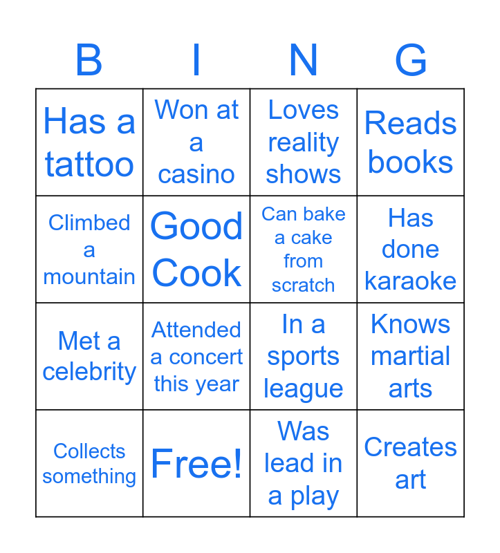This bingo card has 25 words: Has broken a bone, Has Kids, Has done karaoke, Listens to podcasts, Climbed a mountain, Has a tattoo, Good Cook, Won at a casino, Free!, Has an unusual family tradition, Met a celebrity, In a sports league, Has been scuba diving, Traveled out of the country, Can bake a cake from scratch, Ran in a marathon, Was lead in a play, Loves reality shows, Attended a concert this year, Knows martial arts, Collects something, Goes all-out on holiday decorating, Creates art, Reads books and Plays video games.