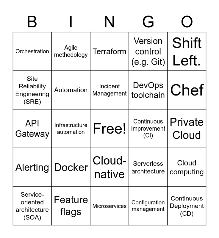 This bingo card has a free space and 50 words: Continuous Integration (CI), Continuous Deployment (CD), Infrastructure as Code (IaC), Microservices, Docker, Kubernetes, Agile methodology, DevSecOps, Site Reliability Engineering (SRE), ChatOps, Automation, Version control (e.g. Git), Cloud computing, Serverless architecture, Observability, Monitoring, Incident Management, Continuous Improvement (CI), Continuous Testing (CT), Shift Left., Infrastructure automation, Configuration management, Orchestration, DevOps toolchain, Jenkins, Ansible, Chef, Puppet, Terraform, Cloud-native, Immutable infrastructure, Chaos engineering, Blue-green deployment, Canary deployment, Feature flags, Serverless computing, Multi-cloud, Hybrid cloud, GitOps., Private Cloud, Public Cloud, Continuous Delivery (CD), Release Management, Application Performance Monitoring (APM), Service-oriented architecture (SOA), API Gateway, Event-driven architecture (EDA), Infrastructure Monitoring, Alerting and Load Balancing.