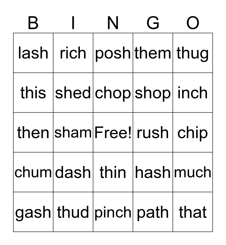 This bingo card has a free space and 24 words: dash, thud, chop, gash, thug, lash, this, rich, rush, thin, shop, then, hash, much, shed, path, chip, posh, inch, sham, that, chum, them and pinch.