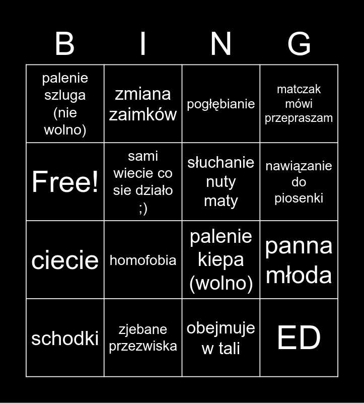 This bingo card has 16 words: zjebane przezwiska, panna młoda, pogłębianie, palenie szluga (nie wolno), ciecie, zmiana zaimków, palenie kiepa (wolno), obejmuje w tali, Free!, sami wiecie co sie działo ;), schodki, matczak mówi przepraszam, homofobia, nawiązanie do piosenki, słuchanie nuty maty and ED.