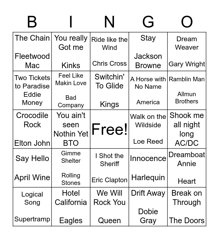 This bingo card has a free space and 24 words: Gimme Shelter Rolling Stones, Hotel California Eagles, Switchin' To Glide Kings, Logical Song Supertramp, Dream Weaver Gary Wright, The Chain Fleetwood Mac, Two Tickets to Paradise Eddie Money, You really Got me Kinks, Walk on the Wildside Loe Reed, I Shot the Sheriff Eric Clapton, A Horse with No Name America, Crocodile Rock Elton John, Innocence Harlequin, Dreamboat Annie Heart, Feel Like Makin Love Bad Company, Drift Away Dobie Gray, Shook me all night long AC/DC, Ride like the Wind Chris Cross, Ramblin Man Allmun Brothers, You ain't seen Nothin Yet BTO, Break on Through The Doors, Say Hello April Wine, Stay Jackson Browne and We Will Rock You Queen.