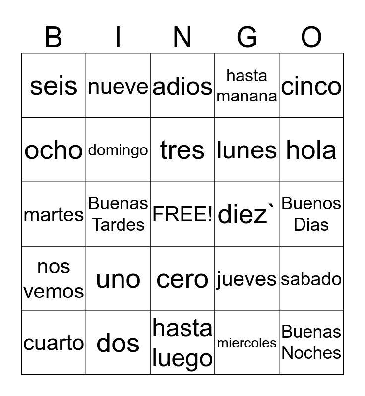 This bingo card has a free space and 24 words: uno, dos, tres, cuarto, cinco, seis, ocho, nueve, diez`, cero, lunes, martes, jueves, sabado, domingo, miercoles, Buenos Dias, adios, hola, Buenas Tardes, Buenas Noches, nos vemos, hasta manana and hasta luego.