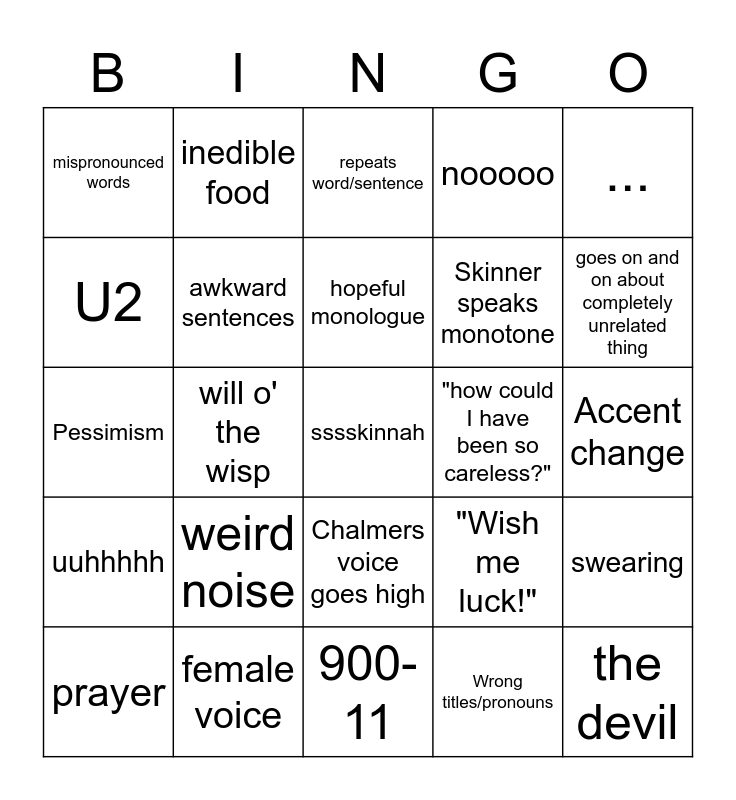 This bingo card has a free space and 24 words: weird noise, female voice, hopeful monologue, prayer, ..., mispronounced words, U2, inedible food, "how could I have been so careless?", Chalmers voice goes high, Skinner speaks monotone, Pessimism, "Wish me luck!", swearing, awkward sentences, Wrong titles/pronouns, Accent change, repeats word/sentence, goes on and on about completely unrelated thing, will o' the wisp, the devil, uuhhhhh, nooooo and 900-11.